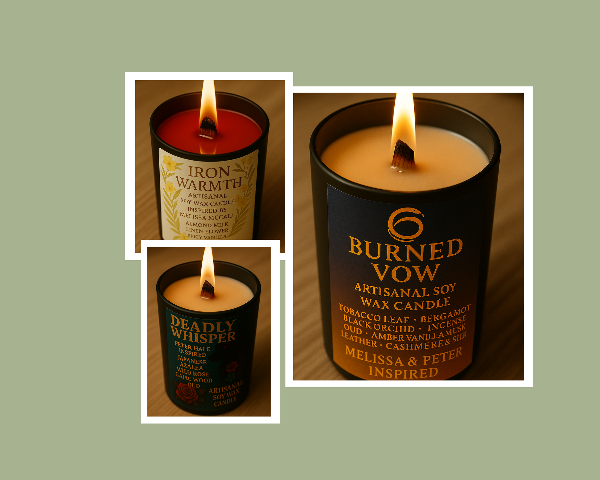 Iron Warmth, Deadly Whisper et Burned Vow forment un trio de bougies dédié à Melissa McCall et Peter Hale, deux âmes liées par des tensions aussi dangereuses qu’inoubliables. Elle, force maternelle, douce et lumineuse, protectrice jusqu’au bout des flammes. Lui, charme venimeux, manipulateur et séduisant, prédateur au sourire trompeur.